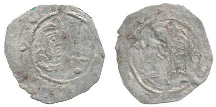Denár - poprsí zprava, před sebou drží meč / anděl zleva klečící před palmovým stromem, před sebou drží prapor nález Ladná (z doby 2. křížové výpravy v letech 1147-48) PV 239 "RR"_nedor.