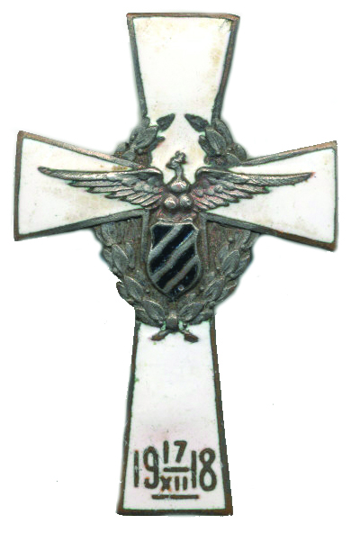 Kříž "17. XII. 1918", němec. orlice v otevřeném věnci stojí na er bu s černě-stříbr. šikmými pruhy bílý smalt 31x48 mm šroub. úchyt