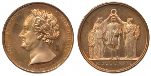 Joh. Wolfg. von Goethe, hlava zprava / Dvě múzy umění vkládají na hlavu umělce vavřín. věnec, ve spodní úseči datace MDCCCXXVI, bez textu sign.: G. Loos Dir. F.König Fec. Cu 40 mm