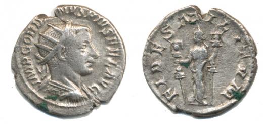 Antoninián, stoj.Fides drží dvě standarty FIDES MILITVM Kank. 5; RIC 209; Sear 8611