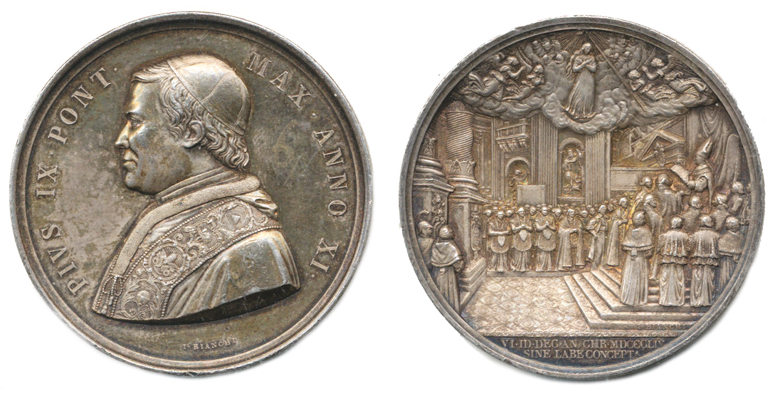 Pius IX. - Vyhlášení dogmatu Neposkvrněného početí P. Marie 1854, Poprsí papeže zleva / obřadní scéna sign.: I. Bianchi Ag 43,5 mm