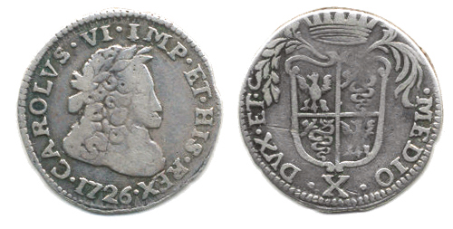 X Soldi (1/2 Lira) 1726, Lombardsko Milán "R" Nov. 45