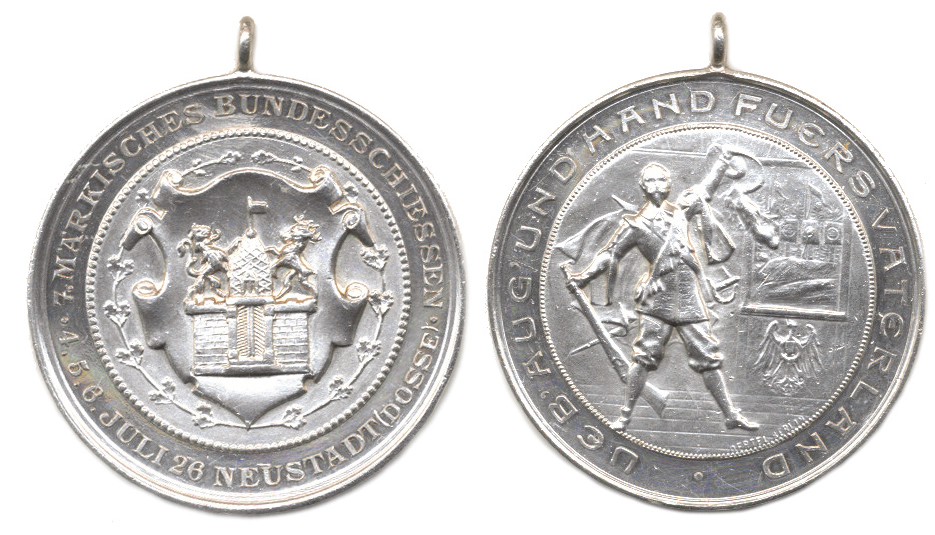 Neustadt a Dosse - 7. Märkisches spolkové střelby 4.-6. 7. 1926, Střelec v historickém kostýmu, opis / Erb v kartuši, opis sign .: Oertel Berlin Ag 990 20,15 g 37,3 mm orig. ouško