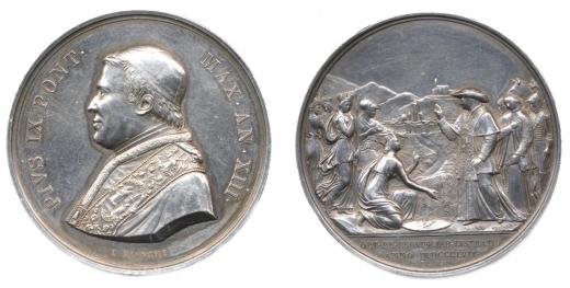 Pius IX.(rok 13), poprsí papeže zleva / alegorická skupina předst avující města a provincie před papežem - 1857 sign.: I. Bianc hi Ag 43,5 mm