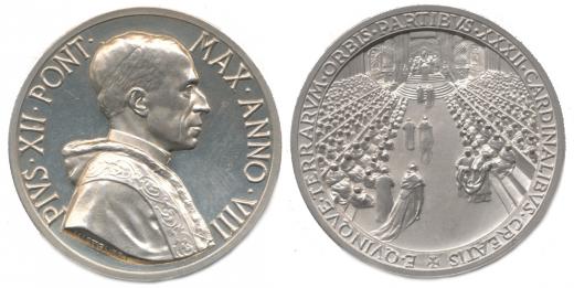 Pius XII., poprsí zprava VIII. rok pontifikátu (1946) / Jmenování 32 kardinálů z pěti kontinentů sign.: MISTRVZZI Ag 44 mm 36,135 g