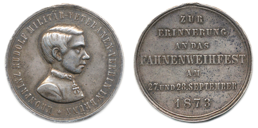 Brno - Korunní princ Rudlof, poprsí zprava a opis / Svěcení prapo ru veteránského spolku 27.-28. 9. 1873, 7-mi řádk. němec. nápis Ag 33 mm "RR"_odstr. ouško