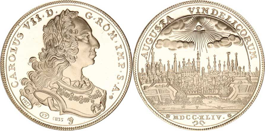 Augsburg - město, Tolar MDCCXLIV (1744) IT, pohled na město / Poprsí cís. Karla VII