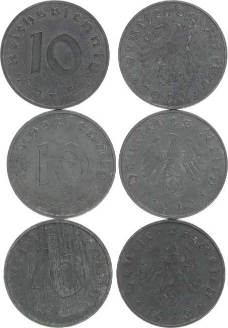 Německo - 3 říše, 1933-1945, 10 Rpf. 1943 A,B,E "R" 3 ks