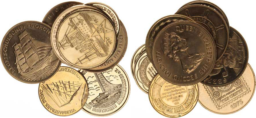 Konvolut, 9 kusů mincí - námět "Lodě" (U.S.A., Afrika, Evropa)