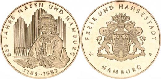 Hamburg, 800 let města a přístavu 1189-1989, Johann Sebastian Bac h a varhany / Městský znak a opis Ag 40 mm 20,14 g