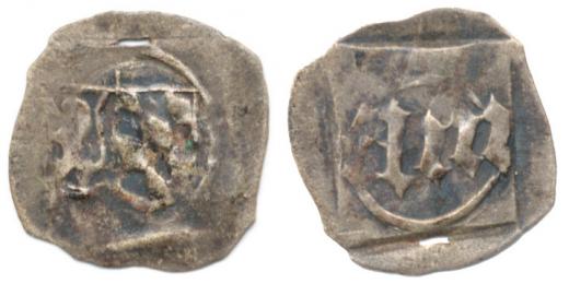 Fenik se čtyřrázem, A: V hladkém kruhu dva erby s falckým lvem abavorskými routami / R: V hladkém kruhu gotická minuskulní písmena a m (Amberg) Rad. XIV /3
