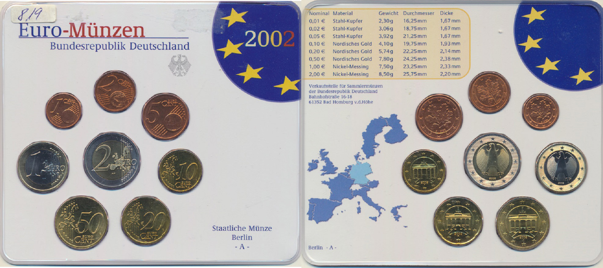 Ročníková sada mincí EURO 2002 minc. A (1, 2, 5, 10, 20, 50 Cent, 1, 2 Euro) orig. balení mincovny MS 124