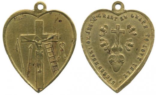 Pašijová medaile, A: Kristus na kříži s atributy umučení / R: Symbol hořícího srdce s atributy mosaz ve tvaru srdce 24x28 mm