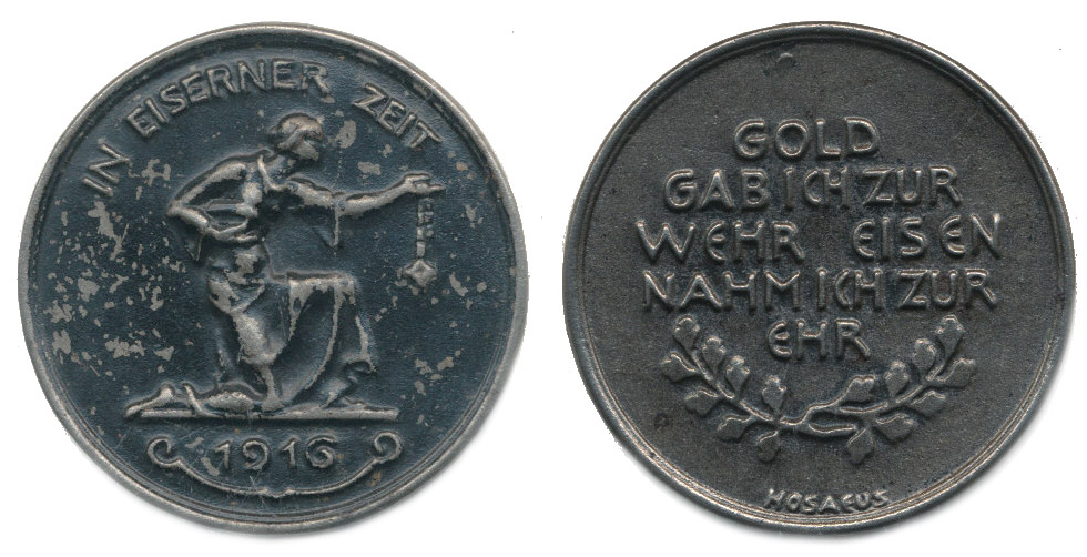 Pamětní medaile za dar zlata na válečné účely v roce 1916. A: Žena v pokleku natahuje ruku se šperkem, opis: IN EISERNER ZEIT - 1916 / R: 5ti řádkový nápis sign.: Hosaeus Fe 39 mm