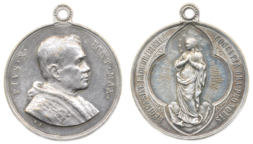 Pius X., Medaile k uctění Neposkvrněného početí Panny Marie, A: Poprsí papeže zprava, opis / R: Panna Maria podobná jako ve zjevení Kateřiny Labouré, opis sign.: S. J. postř. modaz 29,5x35 mm podélné zdobené ouško