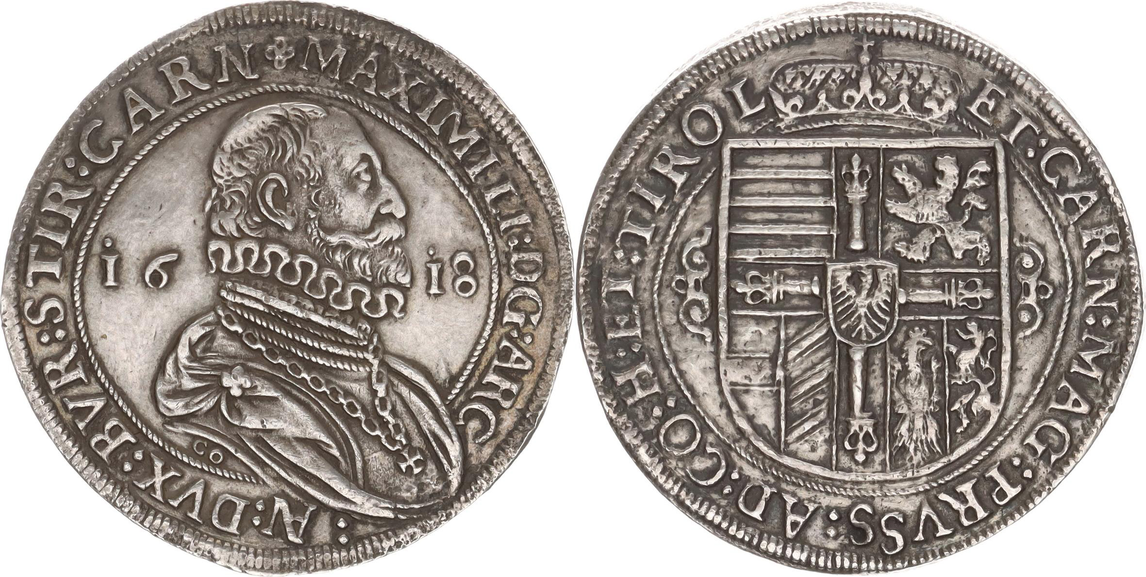 Tolar 1618 CO, Tyroly, Hall var. Voglh. 122/XIII - nad hlavou čtyřlístek, v opise AV jsou spojené nožky, / ET: CARN: MAG: PRVSS: (písmena SS jsou v rozdílné výšce) "R" (27,419 g)