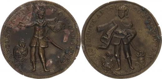 Medaile 1745, posměšná - na korunovaci římským císařem ve Frankfurtu, stoj. císař v uherském kroji / stoj. arcivévoda Josefmosaz 41 mm Nov. XIV/ K-16a_skvrny, jinak