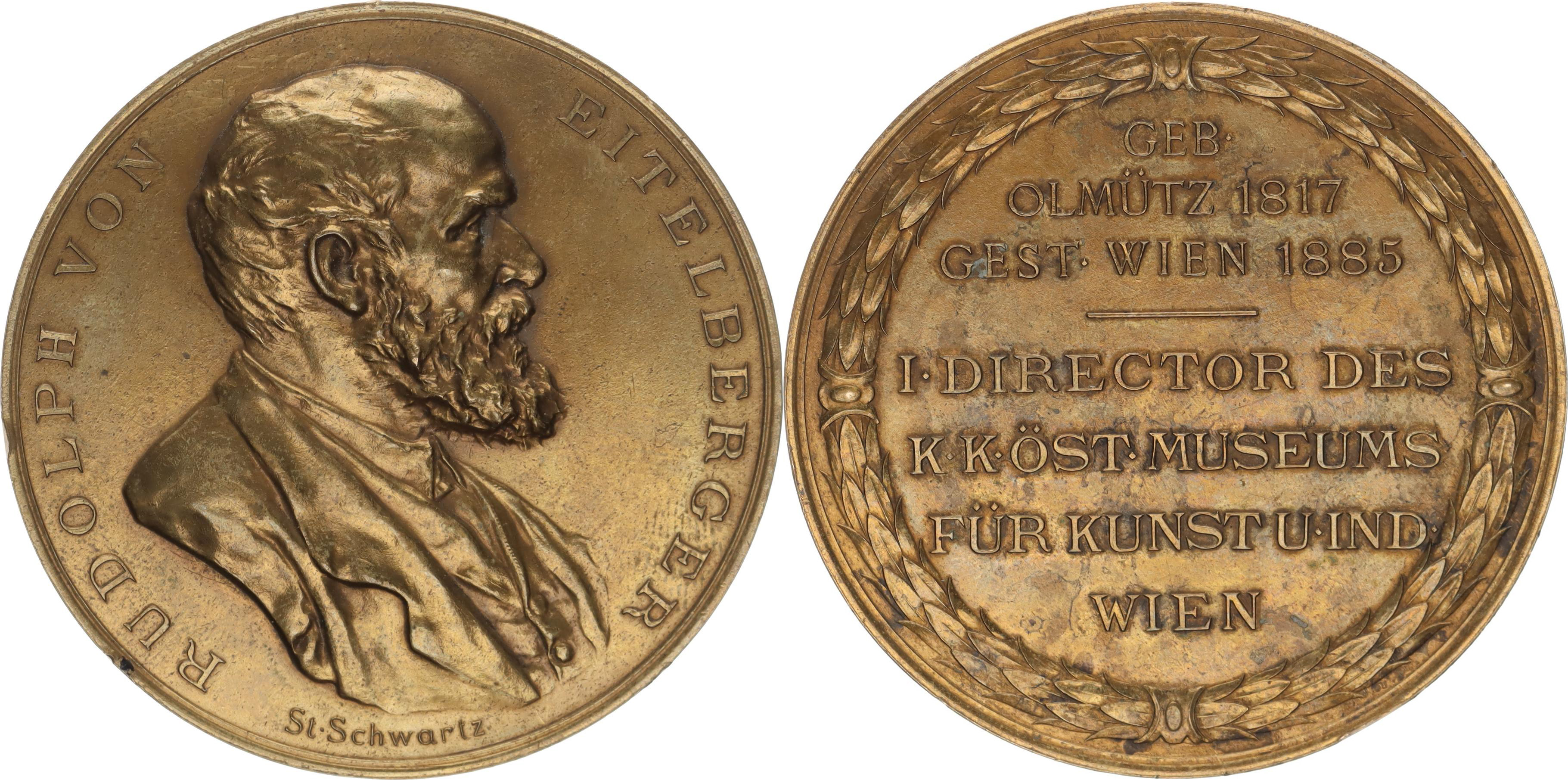 Rudolph von Eitelberger, poprsí zprava / Geb. Olmütz 1817, Gest.Wien 1885, I. Director des. k.k. Öst.Museums für Kunst und Wien, nápis ve věnci sign.: St. Schwartz zlacený bronz 62,2 mm Wb. 1830; Taul neuvádí ! "RR_nep. hr.