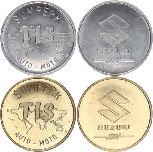 " T I S" Auto - Moto Šumperk, A: podniková zkratka na mapě světa,opis / R: nápis "SUZUKI" a logo mosaz +Al 31,5 mm 2 ks