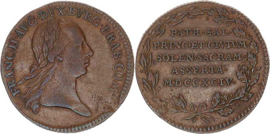 František I. (1792-1835), Žeton na holdování v Belgii (Brusel) v roce 1794 bronz 22 mm
