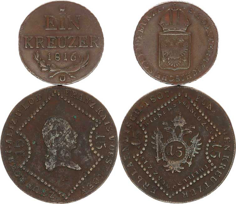 1 kr. 1816 O; +15 kr. 1807 A "R" 2 ks