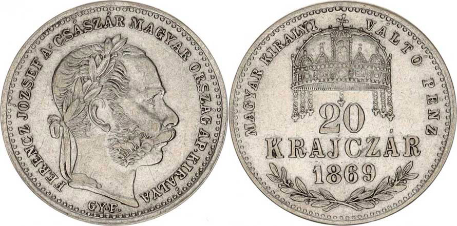 František Josef I.(1848-1918), 20 kr. 1869 GYF "RR"