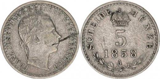 František Josef I.(1848-1918), 5 kr. 1858 A, vada stř. v av.