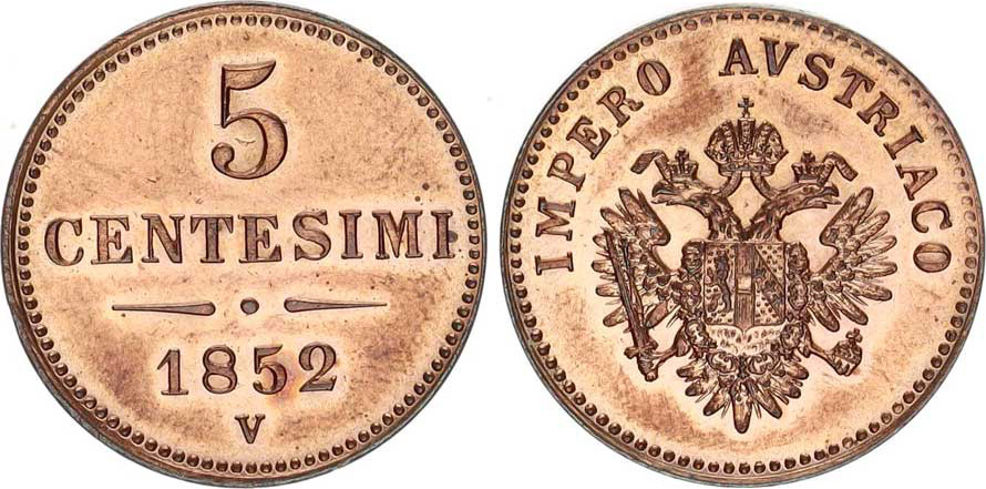 František Josef I.(1848-1918), 5 Centesimi 1852 V "excelentní stav"