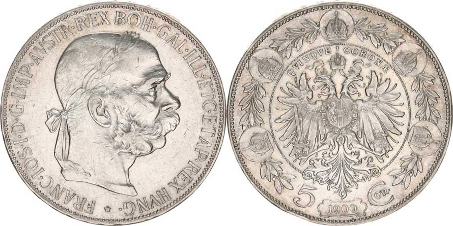 František Josef I.(1848-1918), 5 Koruna 1900 b.zn., dr. rys v av.