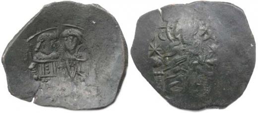 AE miskovitá nomisma (billon aspron trachy), A: Kristus sedí na t růně / R: Sojící císař ve vojenské tunice, Panna Marie mu klade n a havu korunu minc. Konstantunopol SB 1960 2,24 g