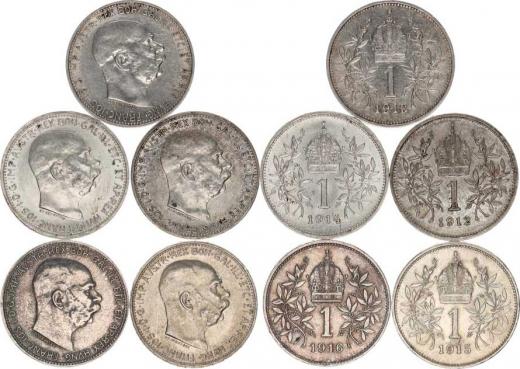 1 Koruna 1912, 1913, 1914, 1915, 1916 vše b.zn. 5 ks