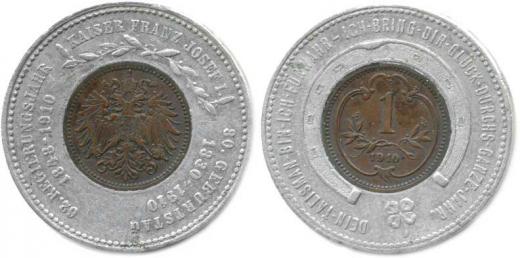 1 hal. 1910 b.zn. vsazený do Al medailonu jako talismanu pro ště stí, K 80. výr. narozeni F.J.I. a 62. výročí vlády Al 32,5 mm
