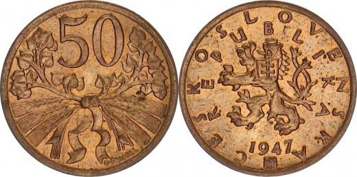 Údobí let 1945-1953, 50 hal. 1947 - bronzový odražek 2,999 g