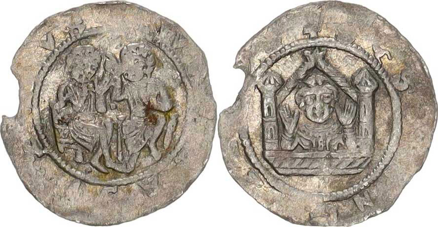 Denár C - 593 ac - značka "E" v poli chybí, kulička mezi sedící mi postavami, mír. vylomen