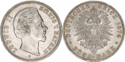 Bavorsko, Ludwig II. (1864-1886), 5 Mark 1874 D KM 502