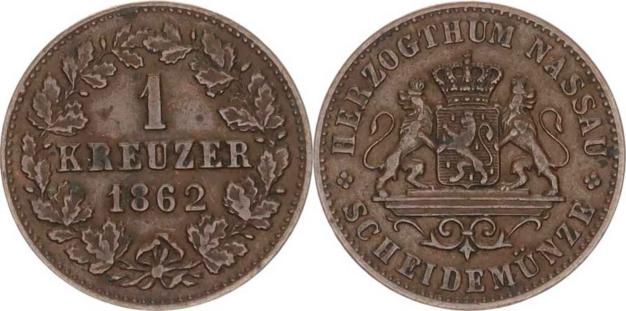 Nassau, Adolph (1839-1866), 1 Kreuzer 1862 KM 74; Cr.54