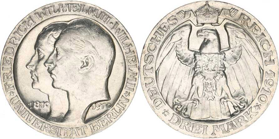 Prusko, Wilhelm II. (1888-1918), 3 Mark 1910 A - Univerzita Berlin KM 530 "R" "excele