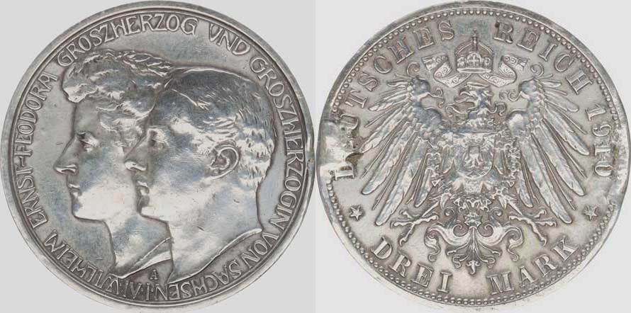 Sasko-Weimar-Eisenach, Wilhelm Ernst (1901-1918), 3 Mark 1910 A - Druhá svatba Y. 176; KM 221 "R"