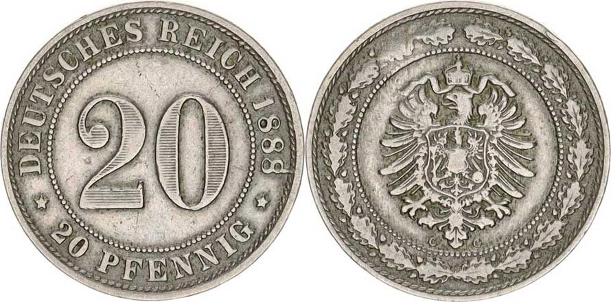 Německo, drobné ražby císařství, 20 Pfennig 1888 G "R", tém.