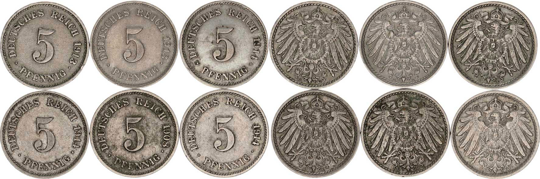 5 Pfennig 1908 G, 1913 E, G, 1914 E, F, 1914 E 6 ks
