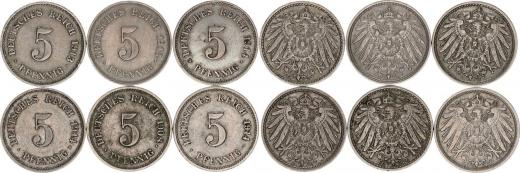 Německo, drobné ražby císařství, 5 Pfennig 1908 G, 1913 E, G, 1914 E, F, 1914 E 6 ks