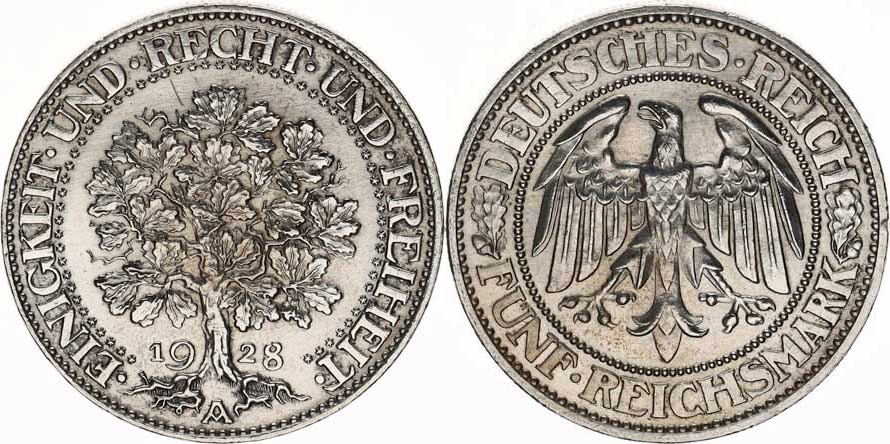 Výmarská republika (1918-1933), 5 RM 1928 A - dub KM 56 "sbírkový stav"