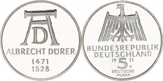 Německo - BRD (1949-), 5 DM 1971 D - Dürer KM 129