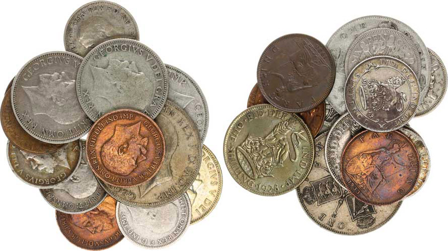 1 Florin 1921, 1923, +1 Shilling 1928(zlacen), 1933, 1935; +3 Pen ce 1913, 1915, 1928, 1930; +Farthing 1918, 1919, 1933, 1936 1 3 ks