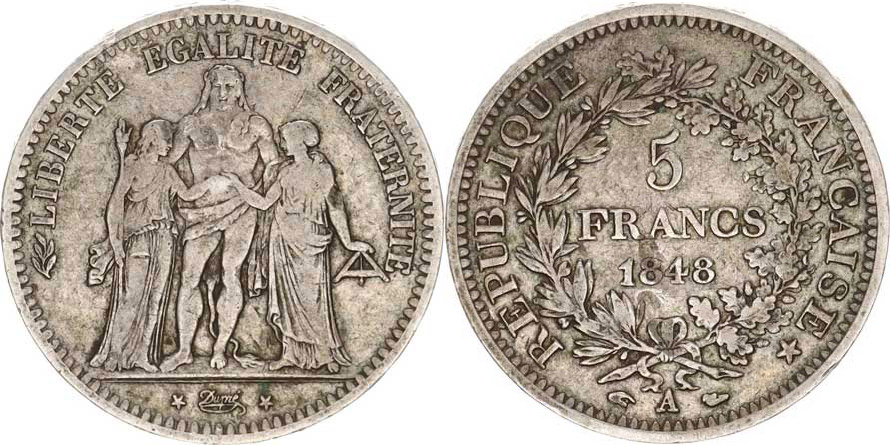 Francie, Druhá republika (1848-1852), 5 Francs 1848 A KM 756,1 24,756g, úhoz