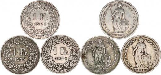 Švýcarsko, 1 Francs 1909 B, 1921 B, 1945 B 3 ks