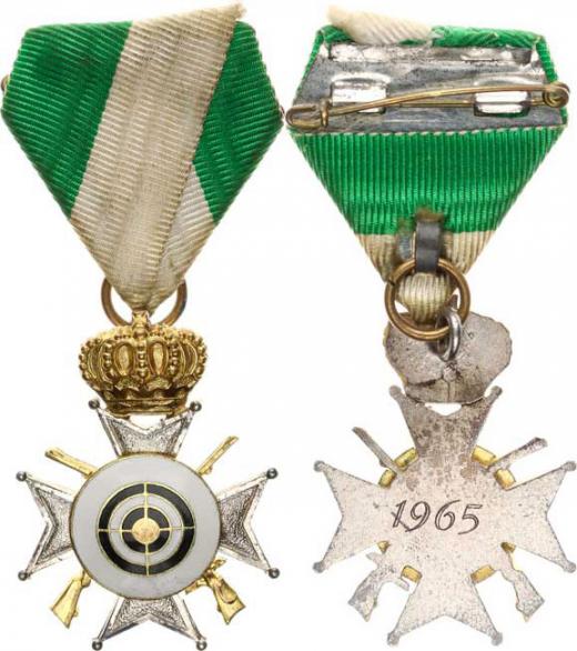 Kříž "1965", datace na rv. / stříbrný kříž završený zlatou koruno u, uprostřed bílo-černo-zlatě smalt. terč 32x47 mm zeleno-bílá s tužka na kolodce