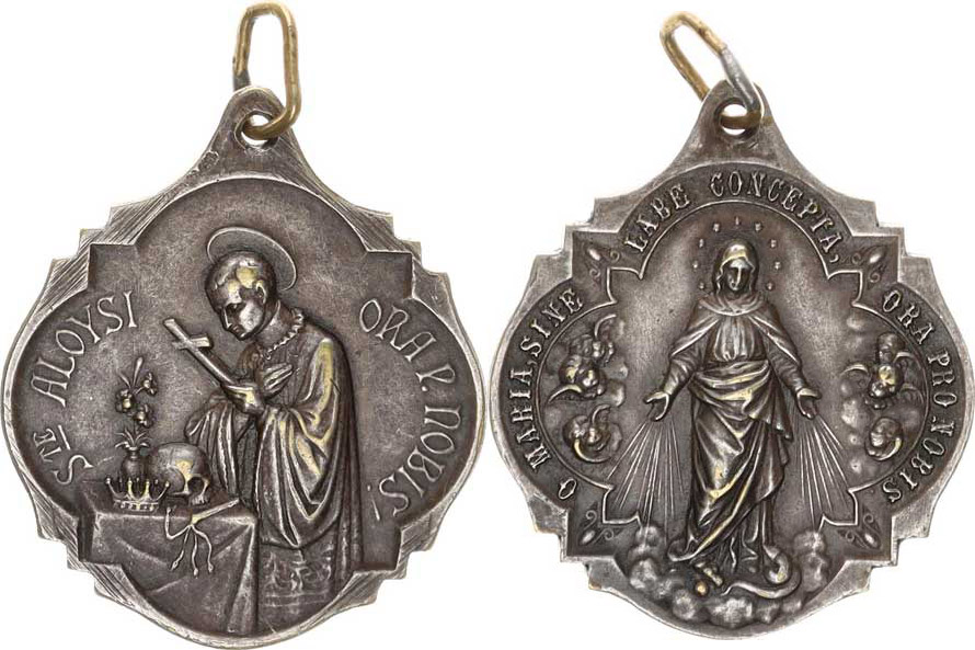 Náboženské medaile, Německo - Sv. Alois s křížem, lebkou, lilií a korunou, opis / Pan