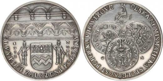 50. výročí založení pobočky v Havířově 1972-2022, městský znak, o pis / nad třemi slezskými mincemi pregéř, opis: Česká numismatick á společnost pobočka v Havířově sign.: ZK (Zbigniew Kaleta) JJ (Jaroslav Jelínek) Ag (1 oz) 35,4 mm vydáno 43 ks ! etue