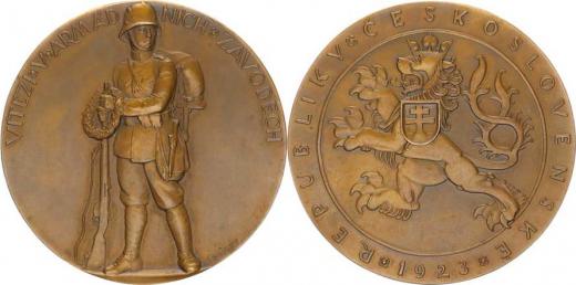 Vítězi v armádních závodech, Stojící voják s puškou a věncem, opi s / Státní znak, ospis: Republiky československé 1923 bronz 55 mm Bo. 111c (raženo 365 ks) původní etue